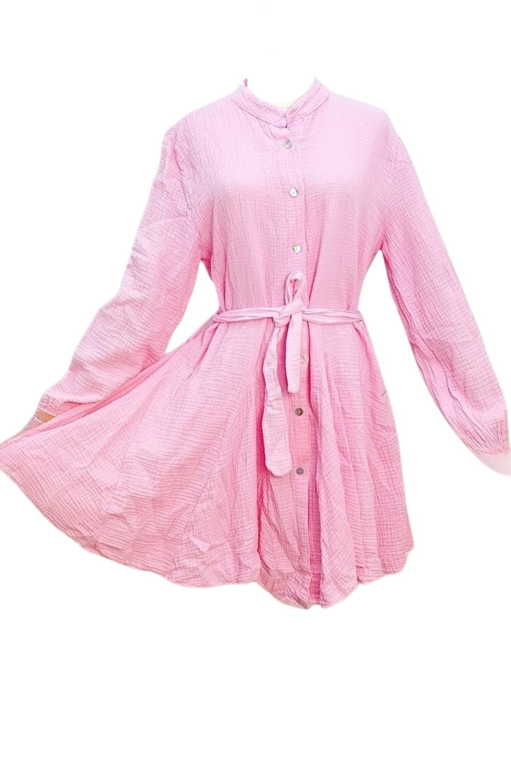 Robe en gaze de coton manches longues, fermeture à boutons sur le devant et ceinture. Taille unique convient d'un 34 à un 42.